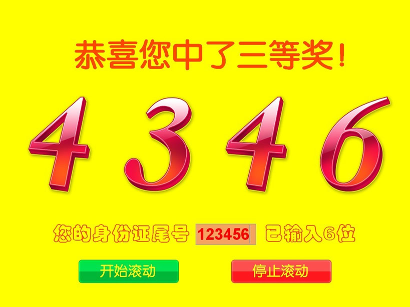 2、按回車鍵啟動(dòng)滾動(dòng),按空格鍵停止?jié)L動(dòng)顯示中獎(jiǎng)號(hào)碼。